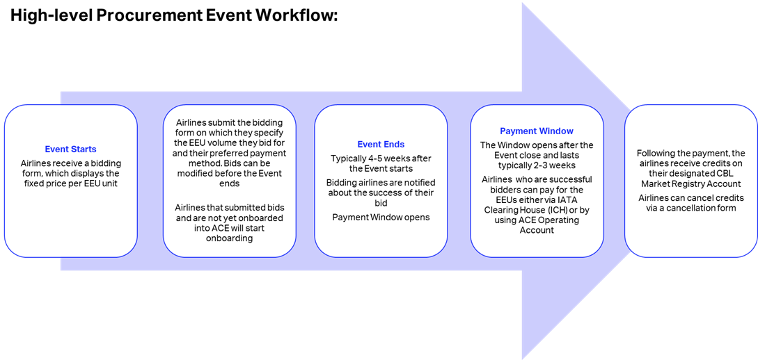 The virtual procurement events are hosted on the IATA ACE Platform and organized by IATA, the technical provider of the ACE platform Xpansiv, various project developers, resellers and States. The duration of these events typically spans over four to five weeks. - Bidding Process: