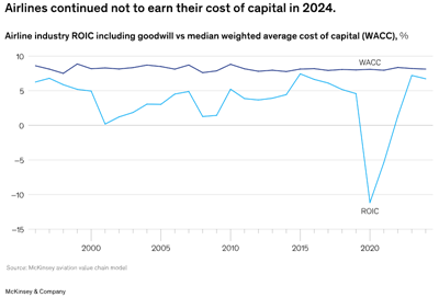 Although airlines’ collective economic performance continued to be better than the 2012 to 2019 average, our analysis shows that the airline sector’s ROIC remained below the weighted average cost of capital in 2024—as has been the case dating back to at least 1996. The share of value-creating airlines in our sample was 36 percent—above the longer-term trend but lower than in 2023, when 46 percent of our airline sample was value creating.