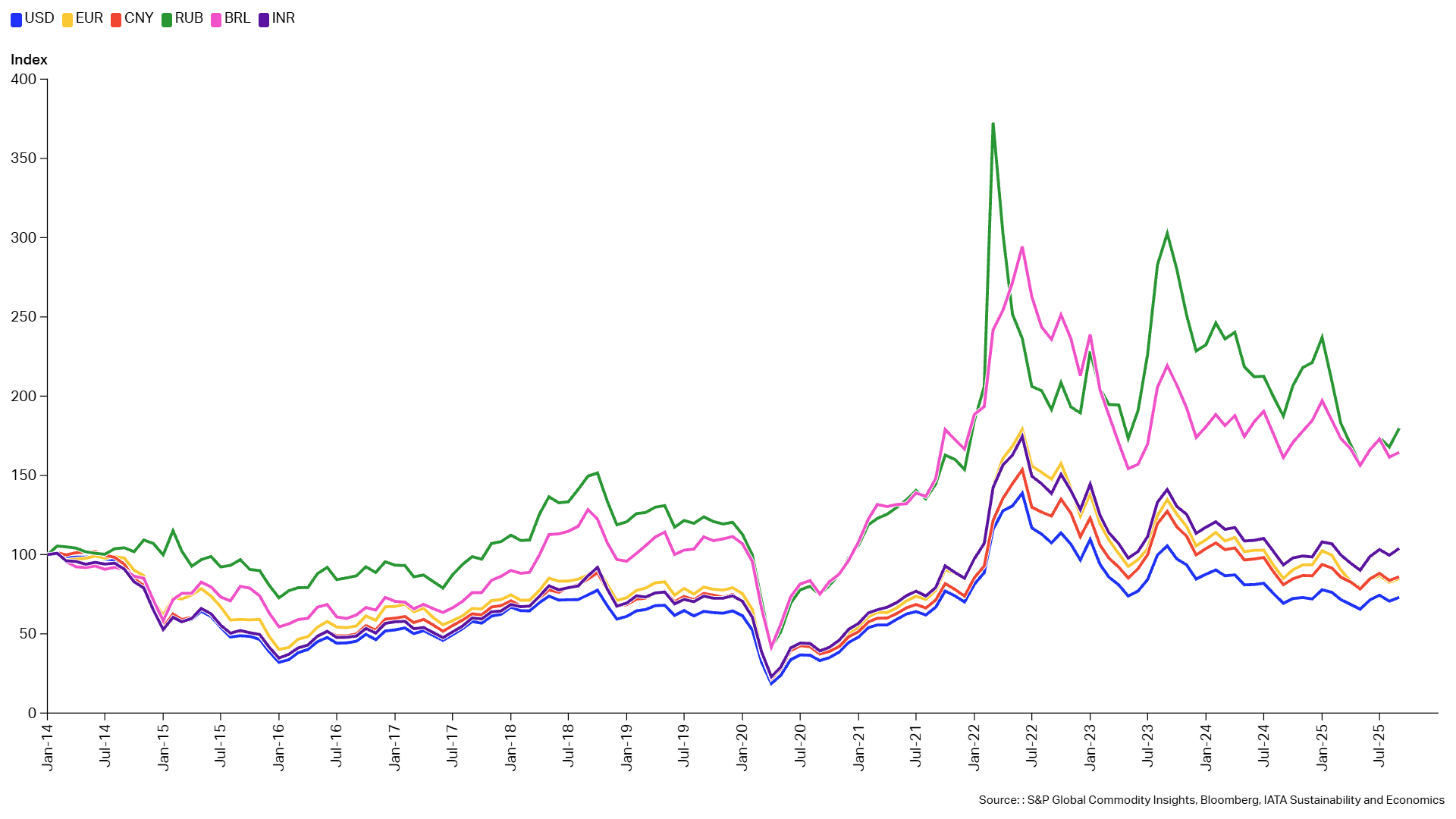 The first chart of the week, a decade ago, showed that jet fuel price declines had uneven impacts across economies due to fluctuations in local currencies against the US dollar. This matters because fuel procurement is typically settled in USD.